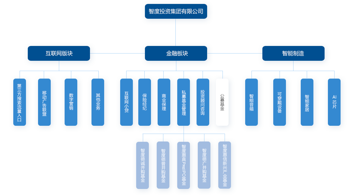 智度集团成立于 2014 年,逐步形成了金融、互联网、智能制造三大业务板块,构建以金 融综合服务为支撑,以互联网和智能制造产业为两翼的战略布局。